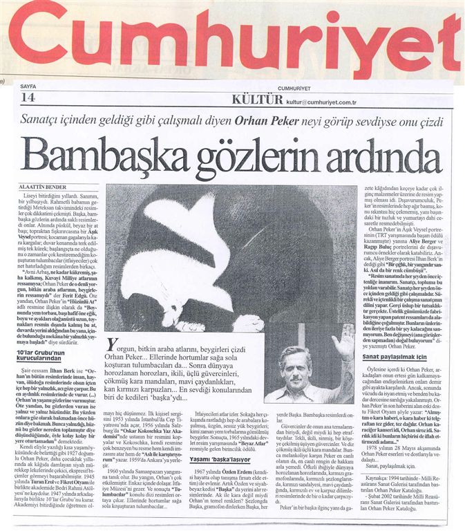 20 Şubat 2026 Cumhuriyet Gazetesindeki Yazım (Orhan Peker) Ressam Orhan PEKER ile ilgili yazım "BAŞKA, BAMBAŞKA" 20 Haziran 2004 tarihinde Cumhuriyet Gazetesi - Kültür sayfasında (syf.14) yayınlanmıştır! Alaattin BENDER Ustaların İzinde... ← Tüm Yazılar Paylaşılmak İçin...
