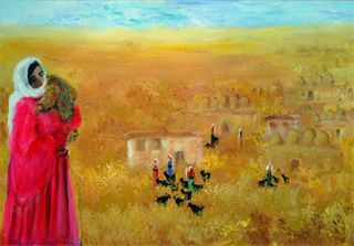 gözlü doğulu kadınların kâh kıraç topraklar üzerinde, kâh toprak damlar